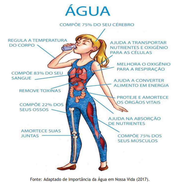 A perda de 20% de água corpórea (desidratação) pode levar as pessoas à morte. Além da água contida em parte dos alimentos, um ser humano adulto precisa tomar, em média, dois litros desse precioso líquido por dia. A água, no organismo, tem função de hidratação, eliminação de toxinas, transporte de nutrientes, lubrificação, reposição de energia, auxilio na digestão, entre outras funções vitais.
