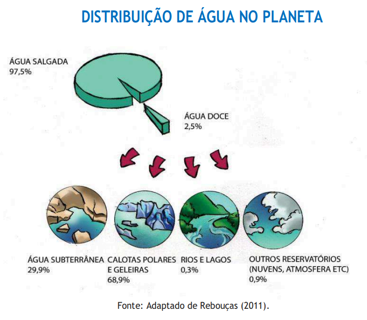 Cerca de 97,5% da água presente em nosso planeta é salgada, constituindo mares e oceanos. O restante, cerca de 2,5%, é de água doce; porém, esta se encontra quase que toda congelada ou no subsolo. Temos, assim, uma abundante quantidade deste recurso, que apresenta distribuição irregular e apenas uma pequena quantidade de água se encontra disponível para o homem e outros seres vivos. Existe muito mais água nos lençóis subterrâneos do que nos rios e lagos, e a maior parte se encontra em lugares muito profundos. Os lençóis de água menos profundos são rapidamente esgotados e grande parte da água superficial corre para o mar.