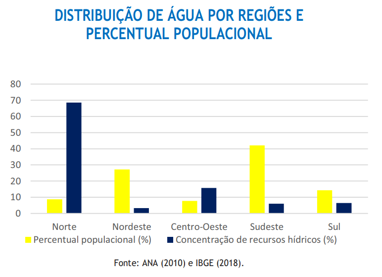 O Brasil detém 12% da água doce disponível no mundo. Entretanto, esse recurso distribui-se desigualmente no país. Segundo dados da Agência Nacional de Águas (ANA, 2010) e do Instituto Brasileiro de Geografia e Estatística (IBGE, 2018) a região Norte conta com 68,5%, maior concentração dos recursos hídricos e o percentual de 8,72% da população brasileira, enquanto a região Sudeste possui um percentual de 42,07% da população do Brasil e somente 6% dos recursos hídricos.
