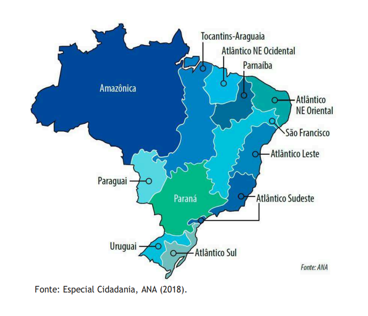 Para facilitar a administração dos recursos hídricos, o Brasil está dividido em 12 regiões hidrográficas representadas na figura abaixo. Estão restritas ao espaço territorial das 27 unidades federativas brasileiras, diferente das bacias hidrográficas que podem ultrapassar as fronteiras nacionais. A região hidrográfica é composta por uma ou mais bacias hidrográficas contíguas e pelas águas subterrâneas e costeiras a elas associadas.
