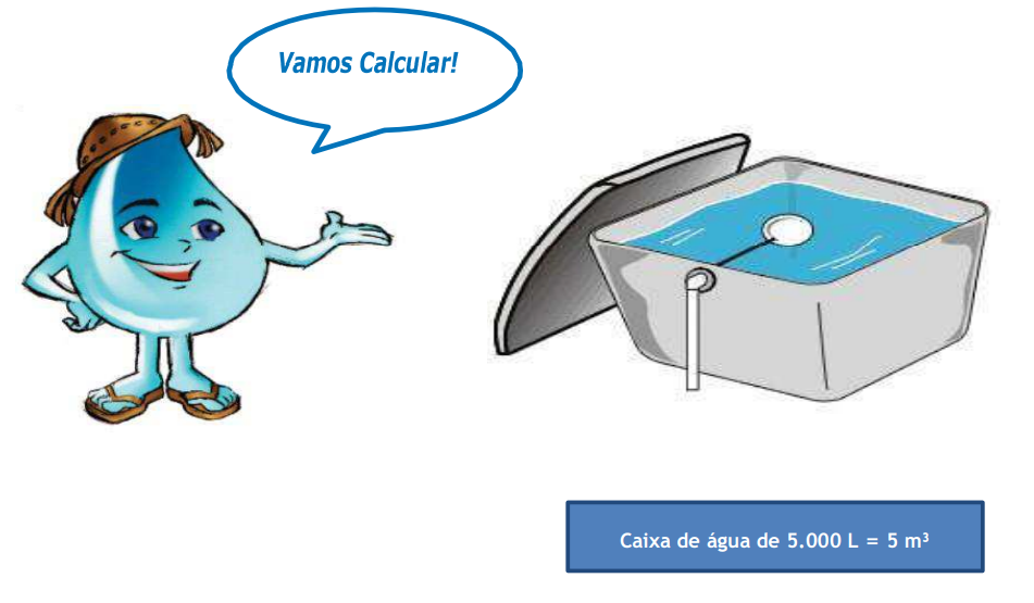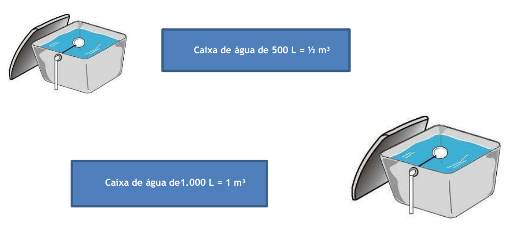médio mensal, que pode ser verificado na conta de água. Como o volume de água apresentado na conta é medido em metros cúbicos (m³) e o volume das caixas d’água em litros (L). A conversão de uma medida para outra é fácil. Como 1 m³ é igual a 1.000 L, basta tirar três zeros.