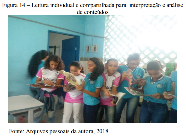 Em seguida, encaminhar os educandos para a biblioteca da escola para leitura individual e compartilhada de gibis para o processo de alfabetização visual. Logo depois, (figura14) solicitar que dialoguem entre si e entre os demais grupos para refletir como utilizar os gibis para a interpretação, compreensão ou exposição dos conteúdos estudados.