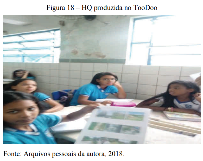 Em seguida juntar todas as tirinhas produzidas, colocar sequenciada, diagramar e apresentar a HQ formada aos educandos. Por fim solicitar que cada grupo apresente rapidamente uma descrição das contribuições do uso dos softwares, verificando as possibilidades e limitações do uso destes para a construção das tirinhas e da HQs, (Figura 18).